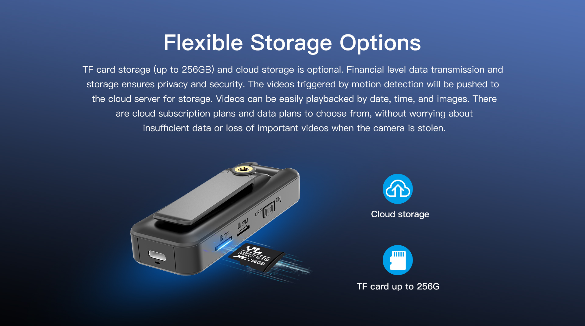 Speicher: MicroSD-Karten bis zu 256GB, historische Videos via App von der Speicherkarte herunterladbar