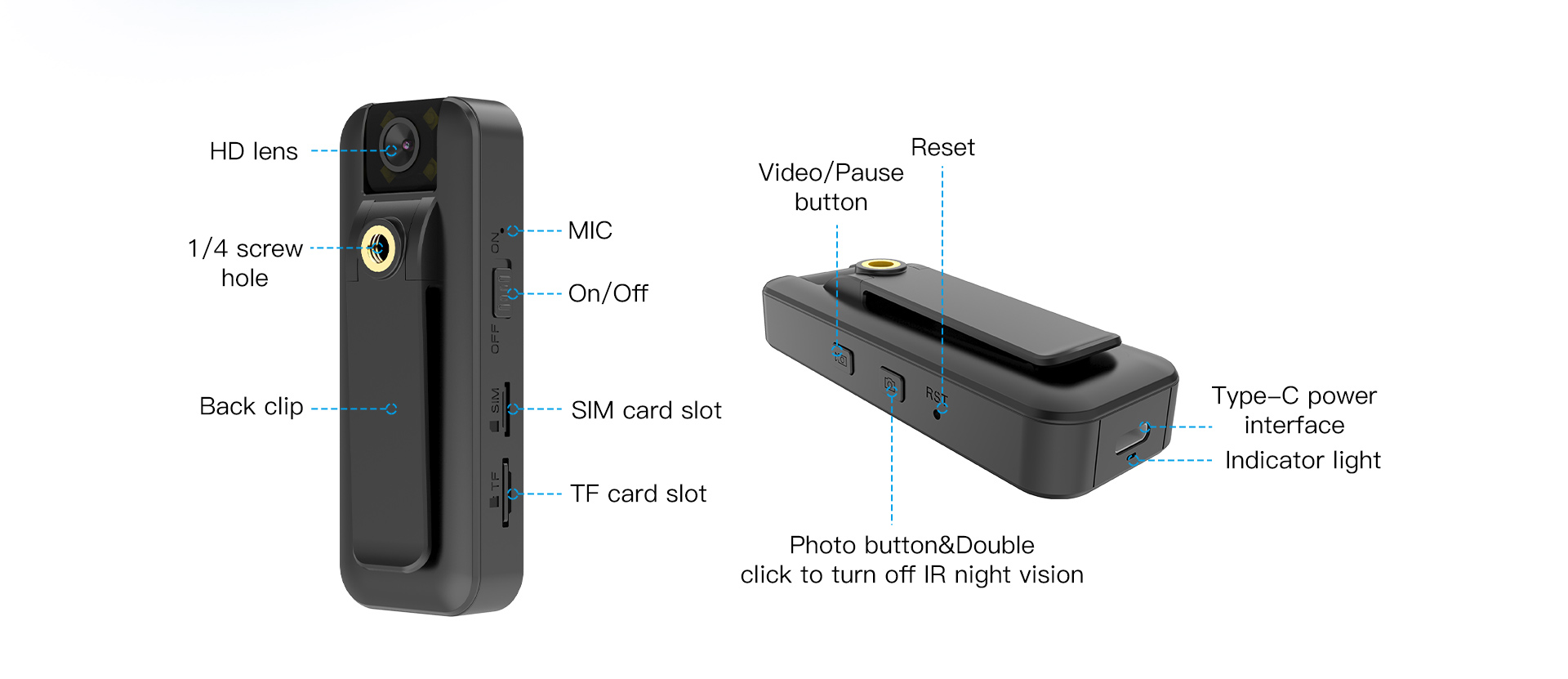 Der Camcorder verfügt über einen hochqualitativen Kamerasensor, der für tadellose 2K-Videos sorgt. Integriert ist zwar ein Bewegungsauslöser, aber wir selbst lassen das Gerät aus Sicherheitsgründen im Dauermodus arbeiten. Nicht sichtbare Infrarotleuchten mit einer Strahlungsdistanz von etwa 5 Metern sind natürlich auch in diesem Gerät verbaut. Den Infrarotmodus benötigen Sie aber nur bei absoluter Finsternis, denn im Normalmodus genügt ein wenig Restlicht, wie etwa von einer Straßenlaterne. Mit einem Kamerawinkel von 130 Grad entgeht Ihnen nichts. Die Linse selbst ist um 180 Grad schwenkbar. Ein abnehmbarer Clip ermöglicht die Anbringung der Kamera an der Brusttasche oder am Gürtel. In diesem Clip ist auch ein Norm-Stativ-Gewinde integriert, falls Sie das Gerät fixiert anbringen wollen. An der Seite der Kamera befindet sich ein MicroSD-Slot (bis 256GB) und ein SIM-Slot. Mittels 4G-Mobilnetz werden die Livevideos auf Ihr Smartphone übertragen und sie können über die kostenfreie App für iOS/Android auch historische Aufnahmen auswerten und herunter laden. Bis zu vier Benutzer können gleichzeitig auf die App zugreifen. Wenn Sie also mit der täglichen Hausarbeit befaßt sind, kann Ihre Frau gleichzeitig aus dem Urlaub zusehen und Ihnen gegebenenfalls weitere Anweisungen geben. Ist Ihnen das noch nicht genug, so können Sie eine (kostenpflichtige) Cloud buchen, in die die Videos hochgeladen werden. Im Bewegungserkennungs–Modus gibt es selbstverständlich auch eine Bewegungsbenachrichtigung auf Ihr Handy. Das Kompressionsformat H.264 ermöglicht Ihnen nicht nur höchste Aufzeichnungsqualität, sondern auch genug Platz auf einer 128GB-Karte für 28 Tage Daueraufnahme. Natürlich können Sie das Gerät auch mit KFZ-Strom, Powerbank oder Netzstrom speisen, aber der integrierte Akku sorgt ohnehin für 8 Stunden Aufnahme. Im autonomen Einsatz zeigt Ihnen die App den aktuellen Akkustand der Kamera an, sodaß Sie wissen, wann Sie die Kamera bergen bzw. gegen eine andere tauschen sollten.